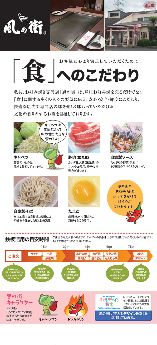 「たかがお好み焼き、されど御好み焼き」を合言葉に、より美味しく、より楽しく、快適で心が和むような文化の香りのする空間で、召し上がっていただきたい。